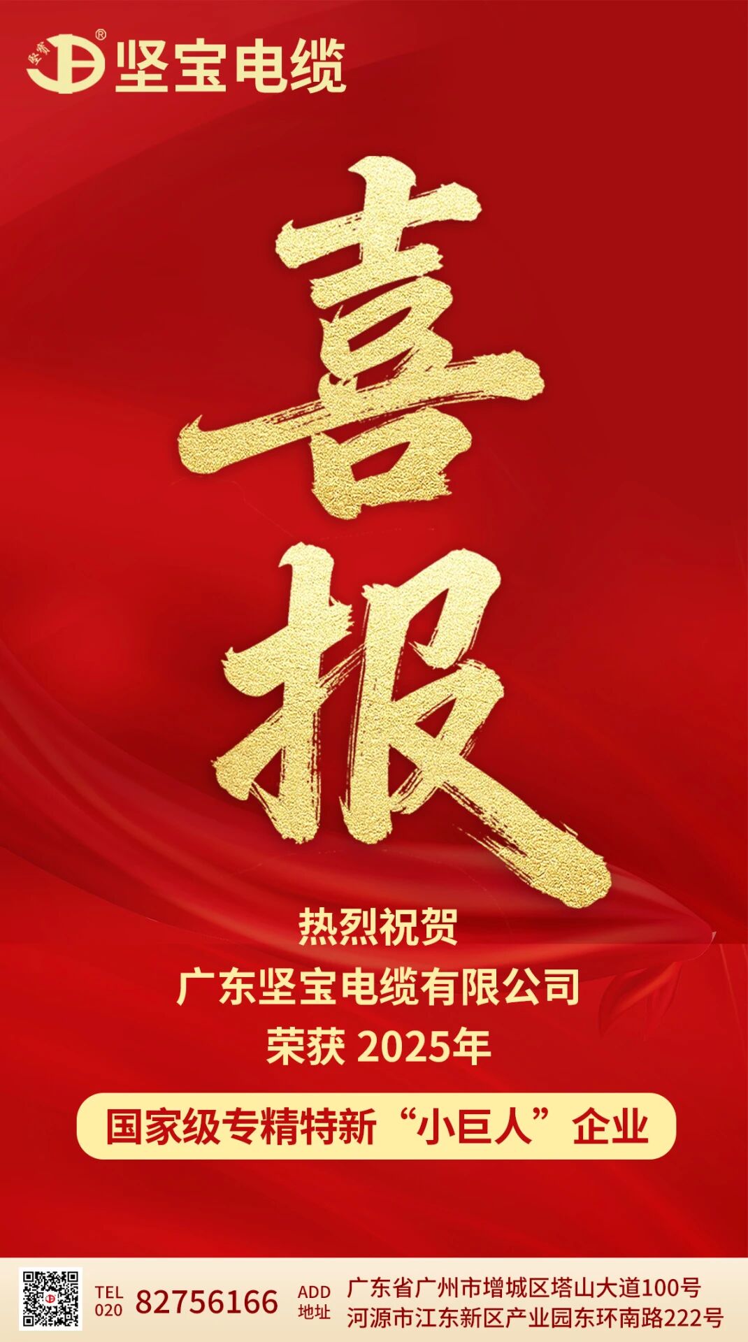热烈祝贺广东坚宝电缆有限公司成功获评国家级专精特新“小巨人”企业!这一荣誉是工信部对企业专业化、精细化、特色化、新颖化发展的高度认可,更是坚宝电缆二十余年深耕电缆领域的实力见证。